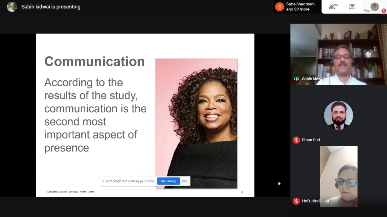 देश में विभिन्न बहुराष्ट्रीय कंपनियों के लिए मानव संसाधन कार्यों का नेतृत्व कर चुके, अपने क्षेत्र के माहिर, श्री किदवई ने साक्षात्कार की तैयारी के साथ ही बातचीत की कला को बढ़ाने पर ज़ोर दिया। एक प्रस्तुति के माध्यम से उन्होंने प्रतिभागियों को ऑनलाइन साक्षात्कार कौशल की बारीकियों को समझाया। कोरोना वायरस से उपजी चुनौतियों के बीच उद्योग की उम्मीदों के बारे में जागरूकता बढ़ाने के लिए छात्रों के लिए यह एक उत्कृष्ट अवसर था। उनकी प्रस्तुति के बाद एक अत्यधिक संवादात्मक प्रश्नोत्त्र सत्र में श्री किदवई ने छात्रों की जिज्ञासाओं को अपनी सारगर्भित बातों से शांत किया। यह वेबिनार, ऑनलाइन नौकरी के साक्षात्कार को क्रैक करने के मामले में आपसी समझ को साझा करने को लेकर काफी कामयाब रहा।