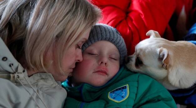 बेरेगसुरनी, हंगरी में, रूस के यूक्रेन पर आक्रमण के बाद एक शरणार्थी आश्रम में, एक महिला अपने बच्चे और पालतू कुत्ते के साथ (रायटर)