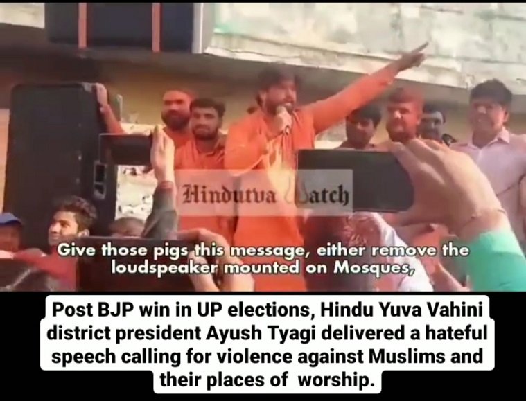 हिन्दू युवा वाहिनी के ज़िला अध्यक्ष आयुष त्यागी ने मुसलमानों के खिलाफ भड़काऊ भाषण दिया। वो बेहद अभद्र भाषा का उपयोग करते सुनाई पड़े। उन्होंने कहा- मुस्लमान वर्ग मस्जिदों में लगे लाउडस्पीकर उतार लें वर्ना हिन्दू वाहिनी मस्जिदों में घुस कर लाउडस्पीकर उतारने का काम करेगी।
