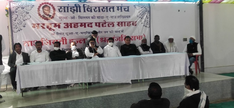जयपुर: सांझी विरासत मंच राजस्थान के तत्वाधान में दिनांक 20 दिसंबर 2020 को मदनी महल सीकर राजस्थान में श्री अहमद पटेल की याद में आयोजित श्रद्धांजलि सभा को संबोधित करते हुए नेशनल कोऑर्डिनेटर अखिल भारतीय कांग्रेस कमेटी अल्पसंख्यक विभाग एवं पूर्व छात्रसंघ अध्यक्ष एएमयू अलीगढ़ डॉक्टर आजम बैग मंच पर. उनके साथ अन्य समाज के वरिष्ठ पदाधिकारी एवं कांग्रेस के वरिष्ठ नेता गण भी देखे जा सकते हैं.