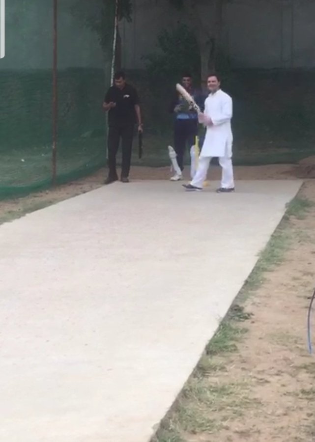 इस फोटो में कांग्रेस पार्टी के पूर्व अध्यक्ष राहुल गांधी के हाथों में बल्ला है और वह गेंद का इंतजार करते नजर आ रहे हैं, जबकि पीछे विकेटकीपर भी है और साथ ही साथ विकेटकीपर के बराबर में एक सिक्योरिटी गार्ड भी खड़ा हुआ है।