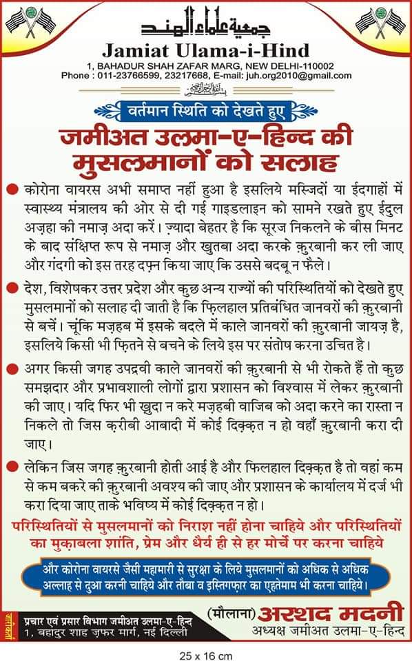 कोरोना वायरस अभी समाप्त नहीं हुआ है इसलिये मस्जिदों या ईदगाहों में स्वास्थ्य मंत्रालय की ओर से दी गई गाइडलाइन को सामने रखते हुए ईदुल अज़हा की नमाज़ अदा करें। ज़्यादा बेहतर है कि सूरज निकलने के बीस मिनट के बाद संक्षिप्त रूप से नमाज़ और खुतबा अदा करके कुरबानी कर ली जाए और गंदगी को इस तरह दफ्न किया जाए कि उससे बदबू न फैले।