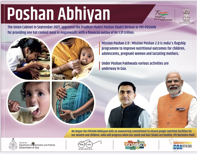 पोषण मिशन के बारे में अधिक जानकारी दें तो पोषण मिशन समग्र पोषण या पोषण अभियान या राष्ट्रीय पोषण मिशन के लिए प्रधान मंत्री की व्यापक योजना, बच्चों, गर्भवती महिलाओं और माताओं के लिए पोषण संबंधी परिणामों में सुधार के लिए भारत सरकार का प्रमुख कार्यक्रम है। इसे 8 मार्च 2018 में जारी किया गया था। और वर्तमान में इसका पखवाड़ा मनाया जा रहा है।