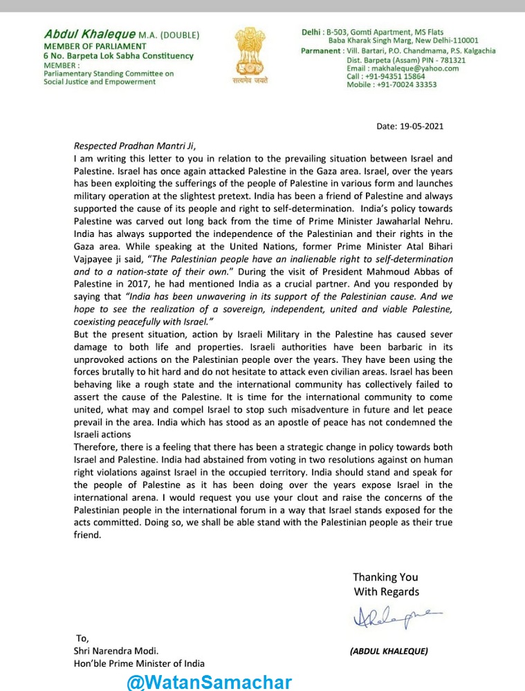 असम के बारपेटा से कांग्रेस के लोकसभा सदस्य अब्दुल खालेक ने बुधवार को प्रधानमंत्री नरेंद्र मोदी को पत्र लिखकर आग्रह किया कि वह अंतरराष्ट्रीय मंच पर फलस्तीनी लोगों की चिंताओं को उठाएं। अपने पत्र में श्री खालेक ने कहा,‘‘ भारत को फलस्तीन के लोगों के लिए खड़े होना चाहिए और बोलना चाहिए जो हम वर्षों से करते आ रहे हैं। मैं आपसे आग्रह करूंगा कि आप अपने रुतबे का इस्तेमाल करें और अंतरराष्ट्रीय स्तर पर फलस्तीनियों की चिंताओं के बारे में बोलें।’’