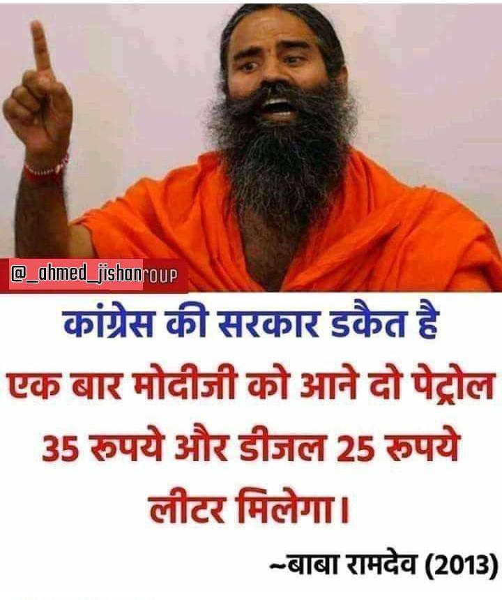 2014 से पहले बाबा रामदेव जोर शोर से भाजपा के लिए प्रचार करते थे। भाजपा को वोट देने और ₹40 प्रति लीटर पेट्रोल पाने का वादा करते थे। आज पेट्रोल 100के पार है। पत्रकार ने जब सवाल किया तो पत्रकार को धमकी देने लगे। शर्मनाक। आइए बाबा के सभी प्रोडेक्ट का बहिष्कार करें। #BoycottPatanjali