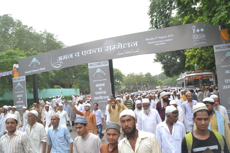 नई दिल्ली 5 अगस्त 2019: देश में जारी मॉब लिंचिंग की अमानवीय घटनाओं और सांप्रदायिकता के बढ़ते कदम को रोकने के लिए आज यहां जमीयत उलेमा ए हिंद के नेतृत्व में तालकटोरा इनडोर स्टेडियम नई दिल्ली में अमन व एकता सम्मेलन संपन्न हुआ। जिसमें हिंदू ,मुस्लिम,सिख ,ईसाई और बौद्ध सहित सभी धर्मों के प्रभावशाली मुख्य विद्वानों और प्रमुखों ने भाग लिया। जबकि स्टेडियम के अंदर और बाहर पचास हजार का समूह था । इस अवसर पर एक संयुक्त घोषणा पत्र पढ़ा गया, जिस का समर्थन मुस्लिम नेताओं के अलावा स्वामी चिदानंद सरस्वती महाराज, जैन धार्मिक नेता डॉक्टर आचार्य लोकेश मुनी,बुद्धिस्ट नेता लामा लव बजांग और मसीही आर्कबिशप अनिल जोसेफ थॉमस कोटो, ज्ञानी रंजीत सिंह गुरुद्वारा बंगला साहिब ने हाथ उठाकर किया। घोषणा पत्र में विशेष रूप से धर्म या राष्ट्रवाद के नाम पर निहत्थे और कमजोर लोगों को इक्का-दुक्का घेरकर मारने,जलाने, मौत के घाट उतारने और सोशल मीडिया के माध्यम से इसका प्रचार-प्रसार करने तथा जनता में भय और निराशा पैदा करने को अत्यधिक घिनौना और घृणित करार देते हुए कहा गया कि यह सब किसी भी धर्म - समाज में बर्दाश्त नहीं किया जा सकता। हम सब हिंदुस्तानी ऐसे लोगों से और उनके मानव विरोधी अभियानों से असहमति और असंलग्नता प्रकट करते हैं और इनके खिलाफ प्रभावी कार्यवाही की पुरजोर मांग करते हैं । यह सम्मेलन केंद्रीय और राज्य सरकारों से मॉब लिंचिंग के खिलाफ तुरंत प्रभावी कानून बनाने की मांग करता है। जिसमें दोषियों को सख्त सज़ा देने के साथ पुलिस और प्रशासन के उच्च पदाधिकारियों को जिम्मेदार करार देते हुए उन्हें भी सज़ा दी जाए।