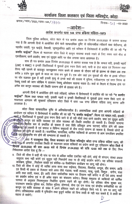 कोटा जिला कलेक्टर और जिला मजिस्ट्रेट, राजस्थान ने साफ साफ आदेश पत्र में लिखा कि कोटा ज़िला साम्प्रदायिक दृष्टि से अति संवेदनशील है। असामाजिक तत्वों द्वारा आगामी त्योहारों के आयोजन एवं वर्तमान में सिनेमाघरों में प्रदर्शित की जा रही द कश्मीर फाइल्स फिल्म एवं चम्बल नदी में युवाओं द्वारा किए जा रहे स्नान से हो रही मौतों, धरना प्रदर्शन, सभा एवं जुलूस आदि से शांति व्यवस्था और लोक व्यवस्था की स्थिति प्रभावित हो सकती है। साथ ही उन्होंने यह भी कहा समाज व विभिन्न समुदायों के बीच तनाव उत्पन्न हो सकता है जिससे लोगों के जानमाल की हानि हो सकती है।