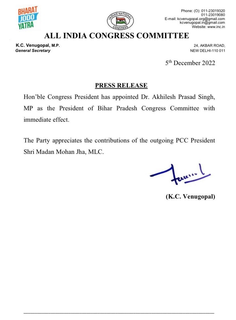 नयी दिल्ली: लंबे अंतराल के बाद आखिरकार बिहार प्रदेश कांग्रेस कमेटी को अपना नया अध्यक्ष मिल ही गया है। नए अध्यक्ष की जिम्मेदारी अब राज्यसभा सांसद अखिलेश प्रसाद सिंह के सर डाली गई है। पार्टी की तरफ से जारी बयान में इस बात की पुष्टि भी की गई है। पार्टी के संगठन महासचिव केसी वेणुगोपाल ने INC संदेश से ट्वीट करते हुए कहा कि कांग्रेस अध्यक्ष मलिकार्जुन खरगे ने डॉक्टर अखिलेश प्रसाद सिंह सांसद को बिहार प्रदेश कांग्रेस का अध्यक्ष तत्काल प्रभाव से नियुक्त किया है।